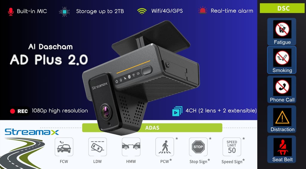 Forward-facing ADAS detects collision risk, lane departure, and tailgating. Driver-facing DMS detects phone use, drowsiness, and distraction — with real-time audio alerts.
