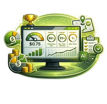 Cost per km, utilisation rate, on-time delivery, idle time — all in one real-time dashboard for fleet managers.
