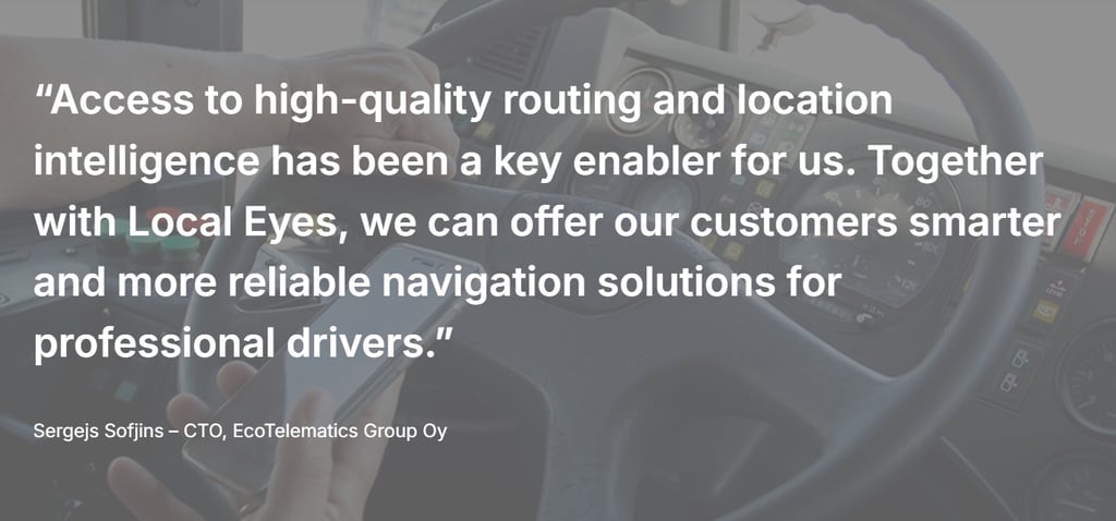 The collaboration between EcoTelematics Group and Local Eyes enables logistics companies to equip drivers with reliable, truck-specific navigation tools. By combining telematics expertise with enterprise-grade location intelligence, EcoTelematics Group delivers navigation solutions designed for the real-world needs of professional fleet operations.