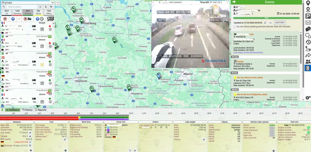 Telematics data. Monitor and analyse truck parameters, that are related to fuel consumption and safe driving. Main reading parameters are Driven distance, Driving time, Fuel consumption, Cruise control, Average speed, Fuel consumed, Idling duration, Maximum speed, Axle weight, Trailer application and others.